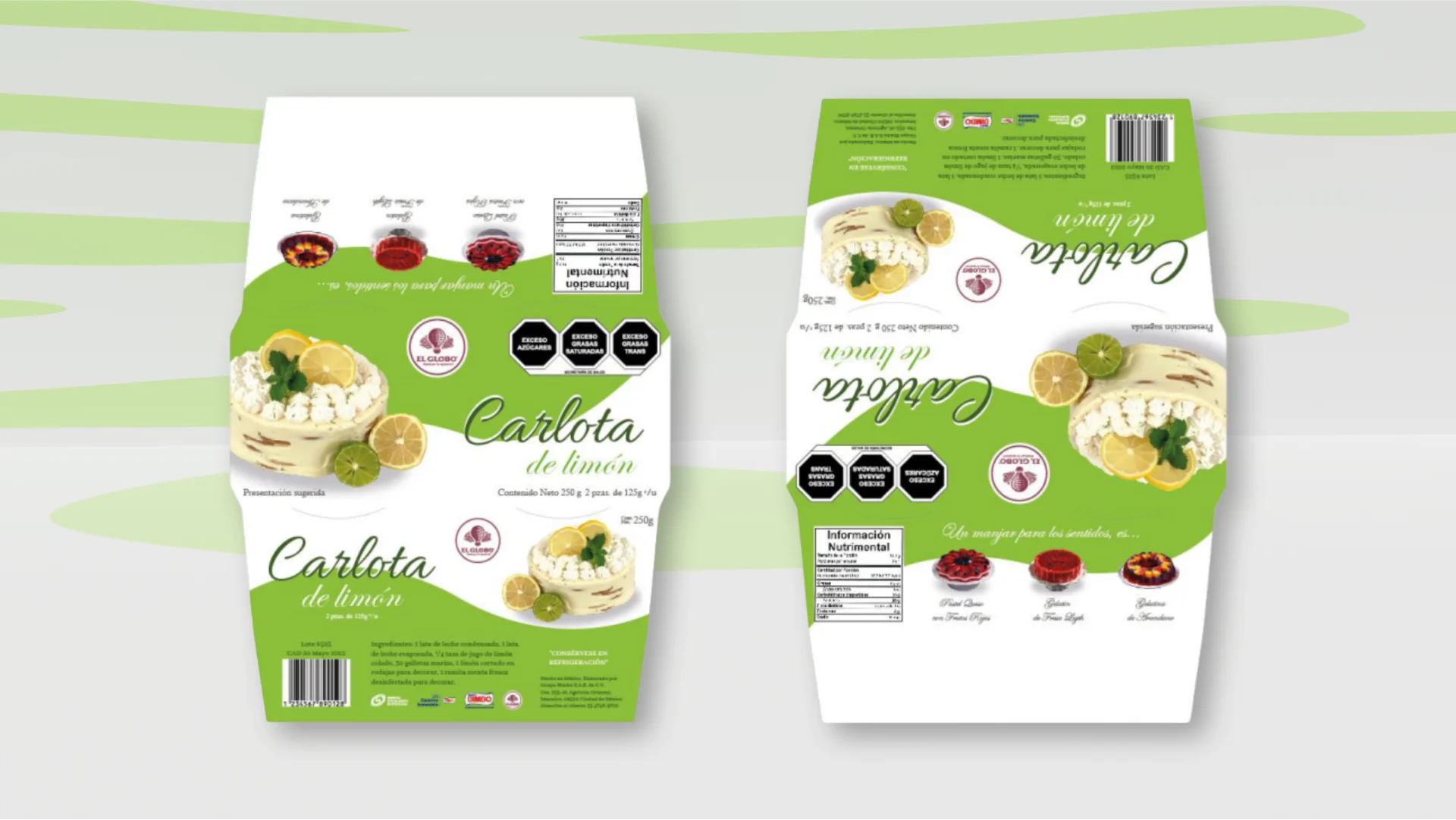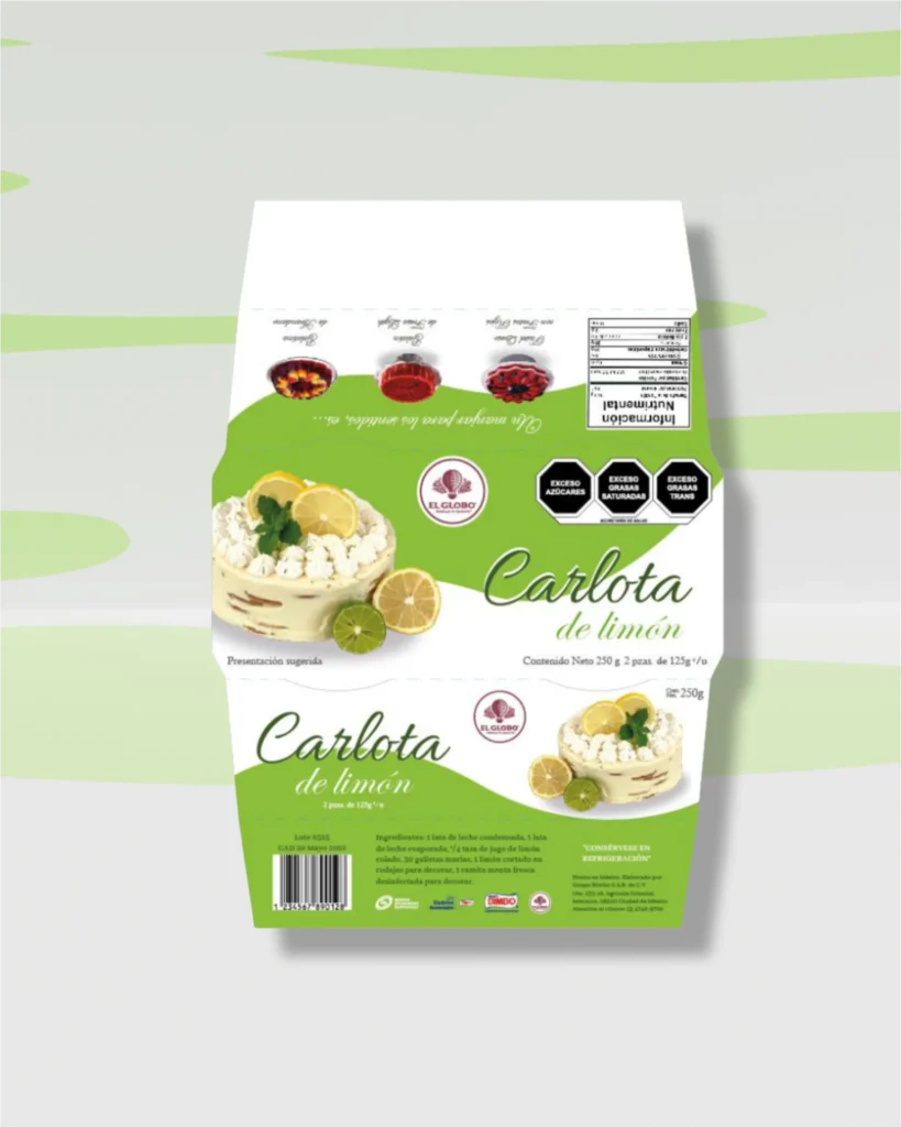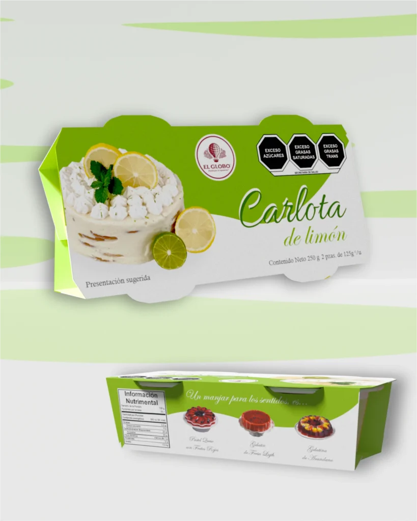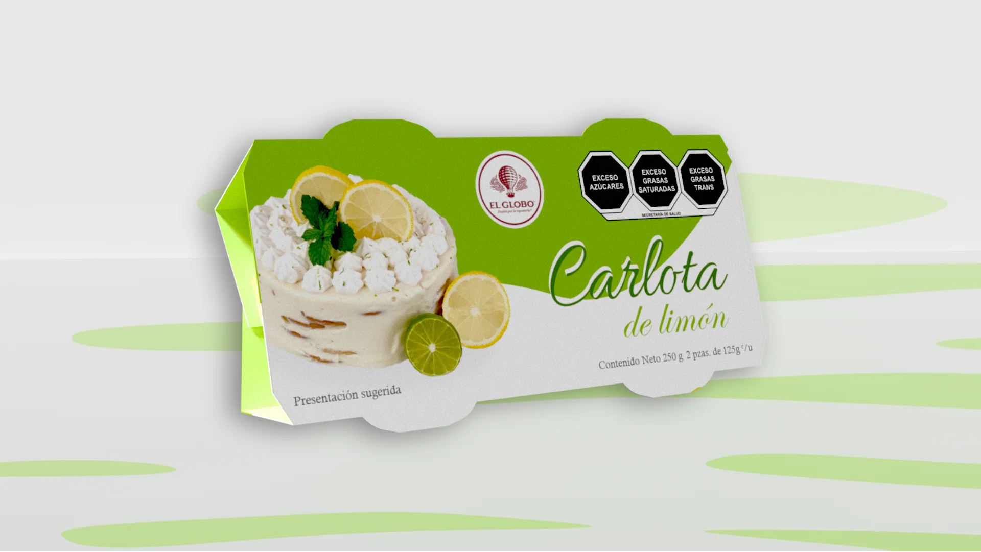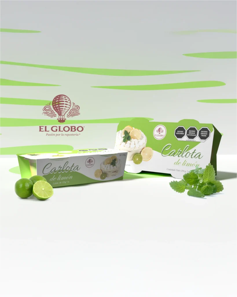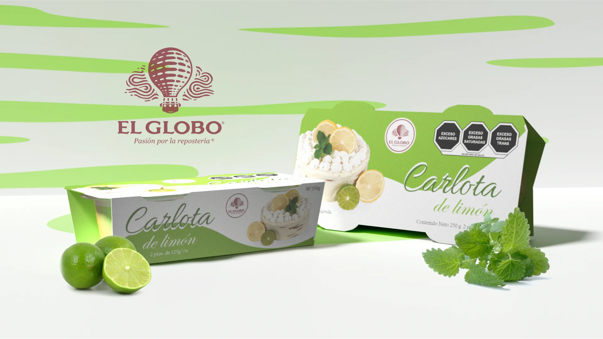 Diseño de packaging para Carlota de Limón, nuevo producto de postre creado para El Globo, reconocida cadena mexicana de panadería y postres. El proyecto incluyó diseño de fajilla de caja, modelado 3D, mockups digitales y cumplimiento de regulaciones mexicanas, posicionando este producto como oferta complementaria en sus sucursales.