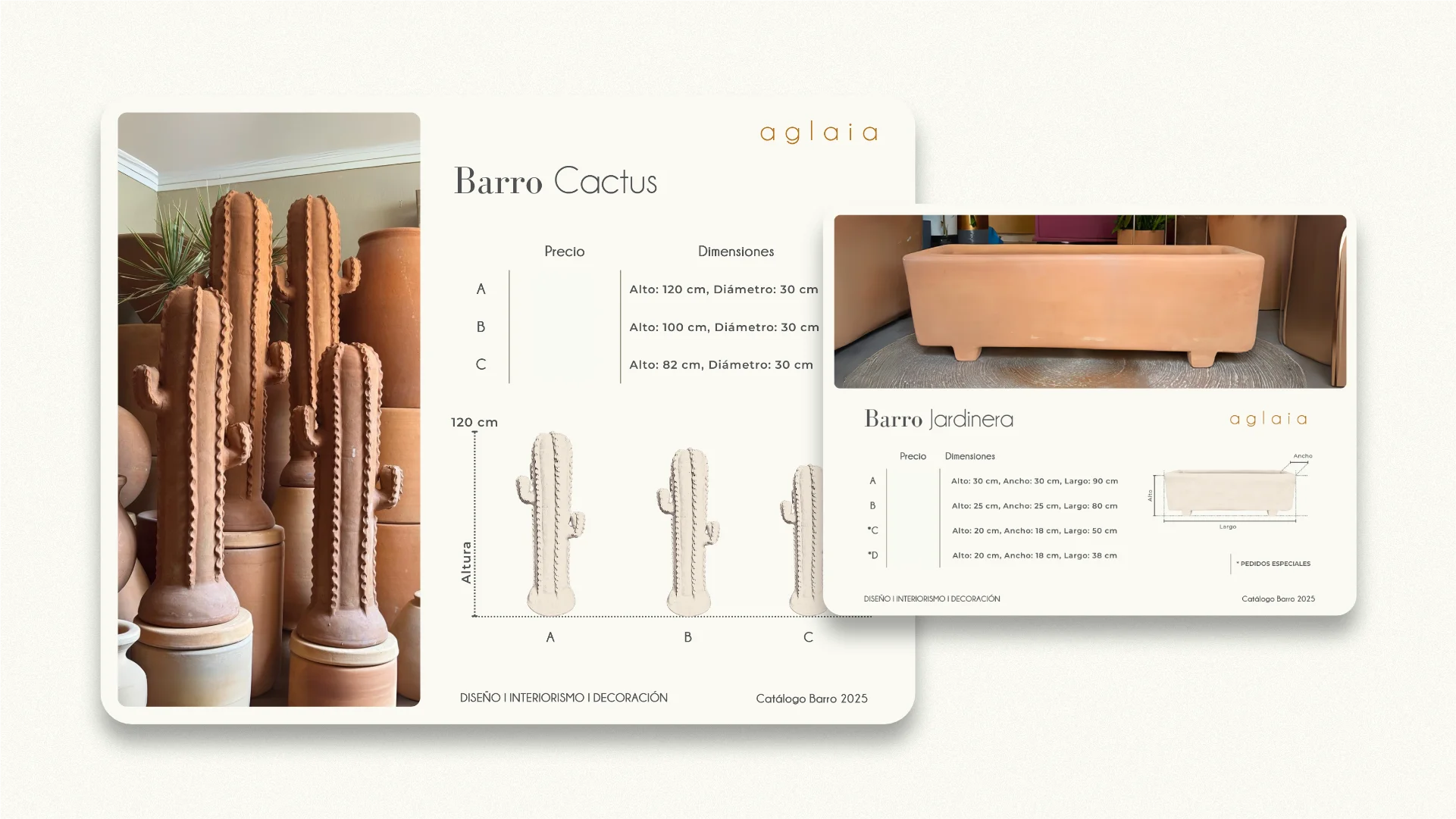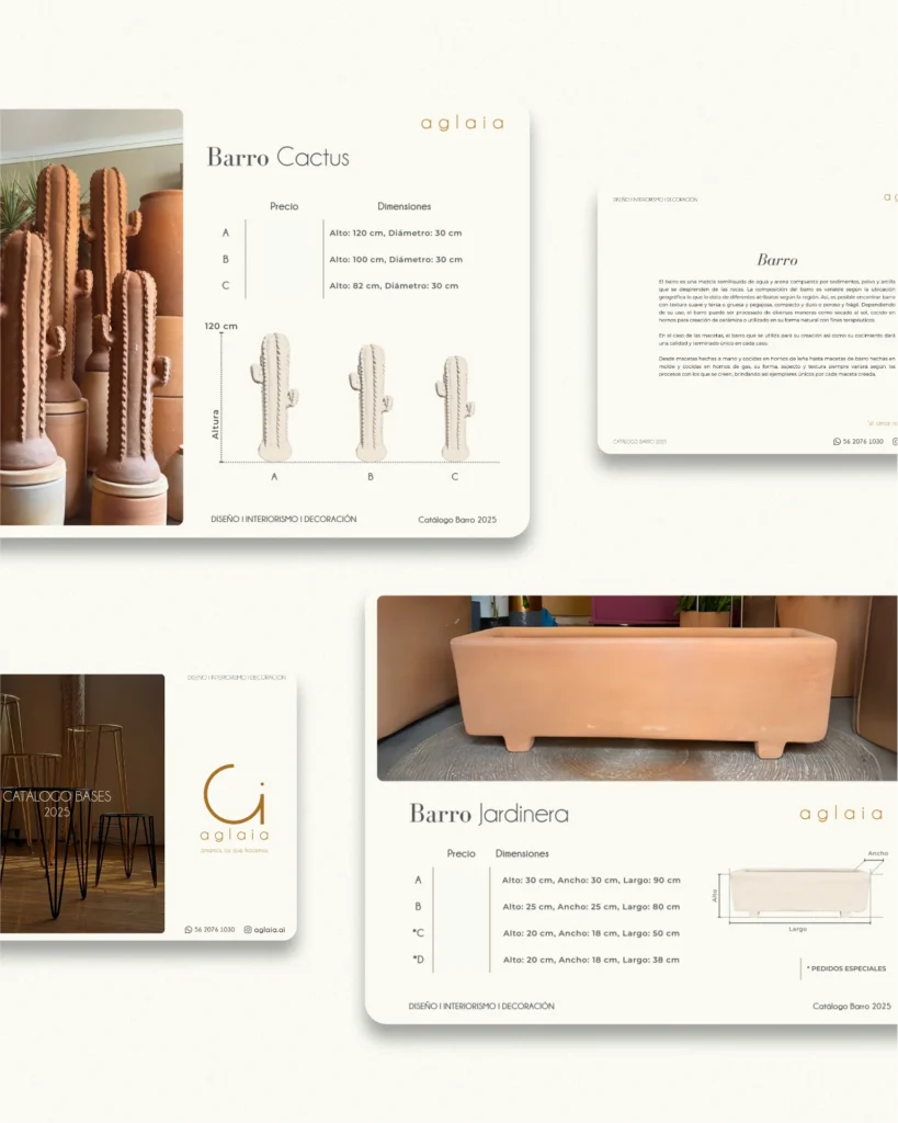 Desarrollo y actualización de cuatro catálogos editoriales para Casa Aglaia, showroom especializado en macetas y jarrones de barro, terracota y bases metálicas ubicado en Narvarte, CDMX. El proyecto incluyó ilustraciones técnicas de productos, esquemas dimensionales y diseño editorial para comunicar eficientemente el inventario, dimensiones y relación entre piezas.