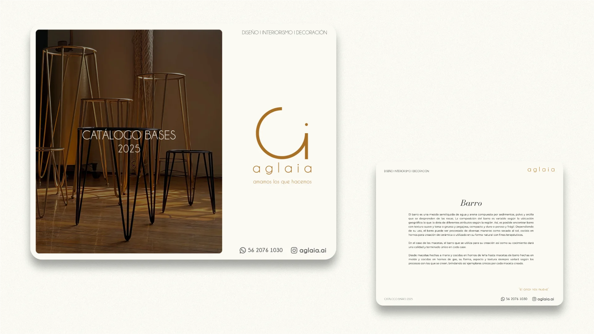 Desarrollé cuatro catálogos con diseño editorial limpio y funcional, incorporando ilustraciones técnicas de cada producto, esquemas comparativos de dimensiones y fotografías editadas profesionalmente. La paleta cromática y tipografía refuerzan la identidad artesanal de Casa Aglaia, mientras que la estructura visual facilita la consulta rápida y ordenada de productos.