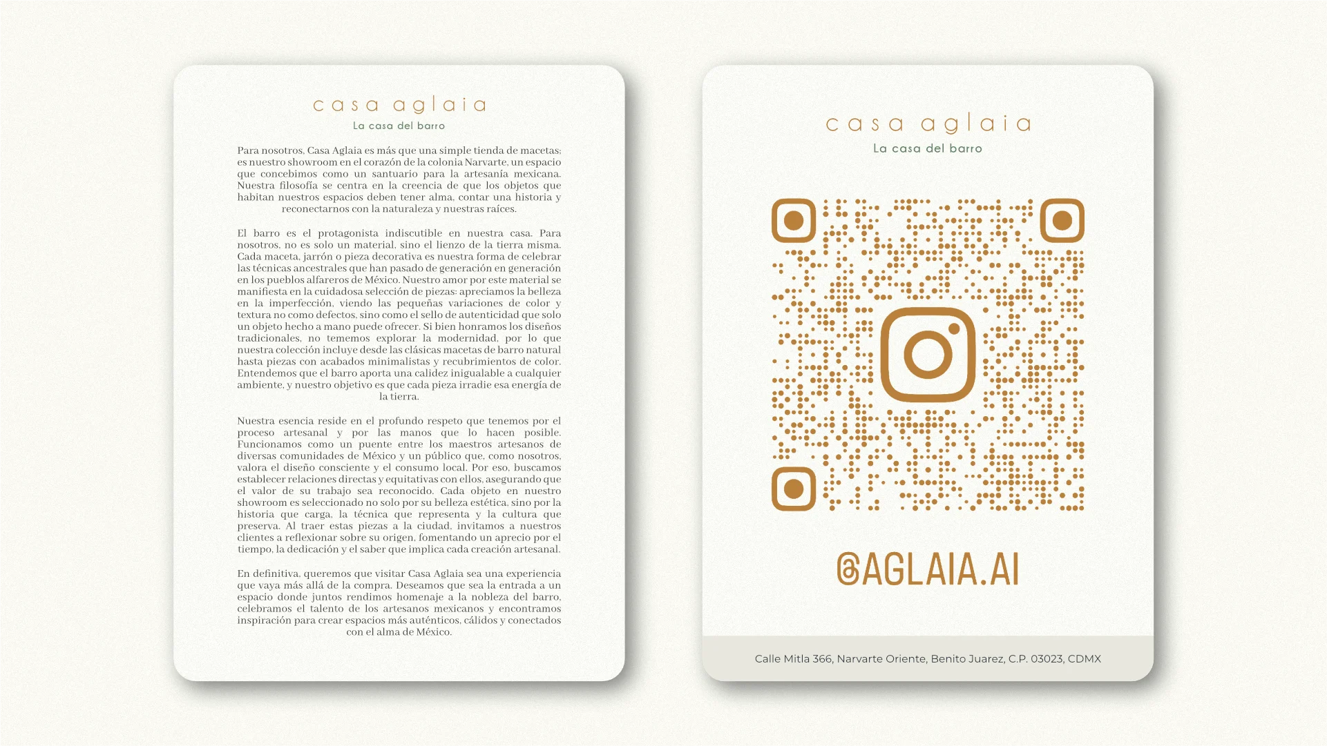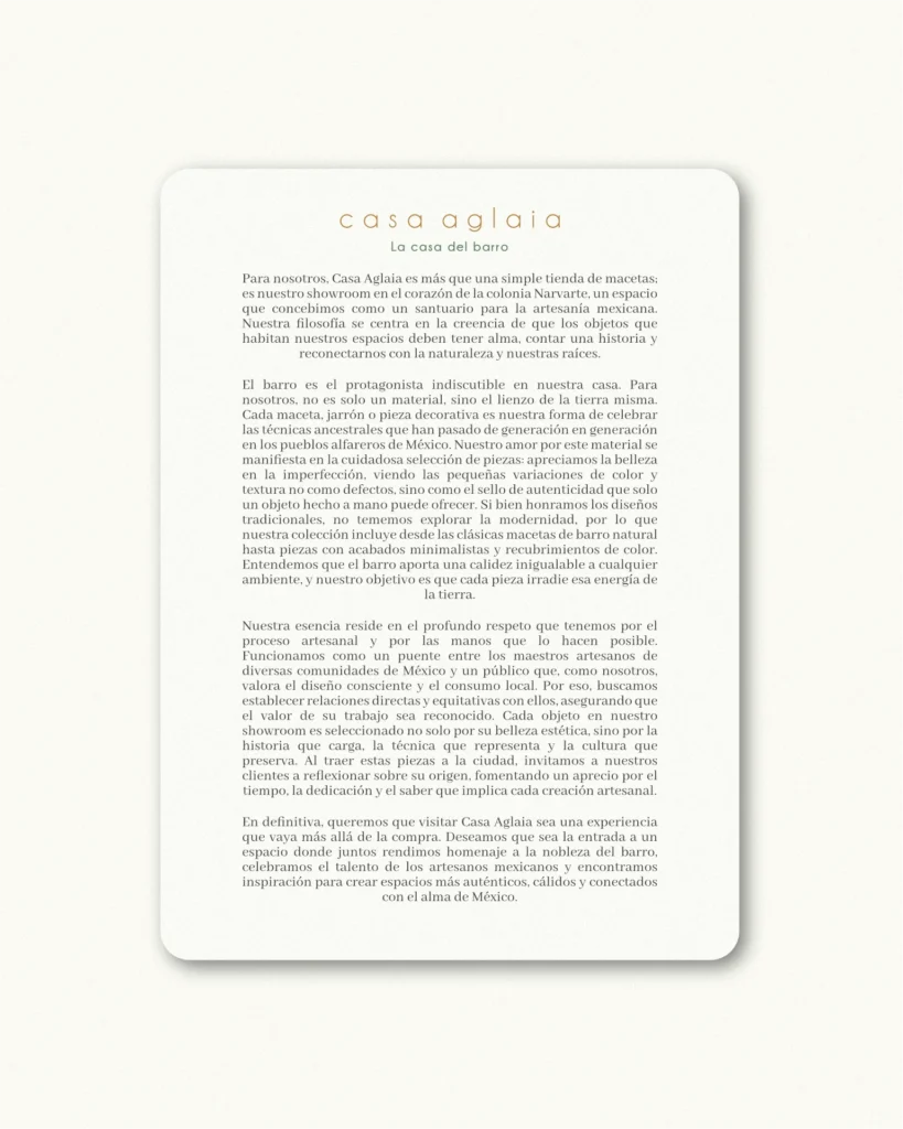 Casa Aglaia es un showroom ubicado en Narvarte, CDMX, especializado en la venta y renta de macetas, jarrones y bases de barro, terracota y metal de gran formato. Se autodenominan «La Casa del Barro» y ofrecen piezas artesanales para decoración de interiores, proyectos de interiorismo y plantas.