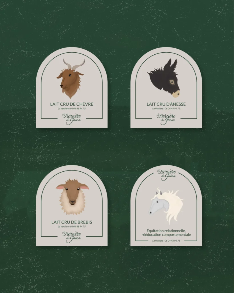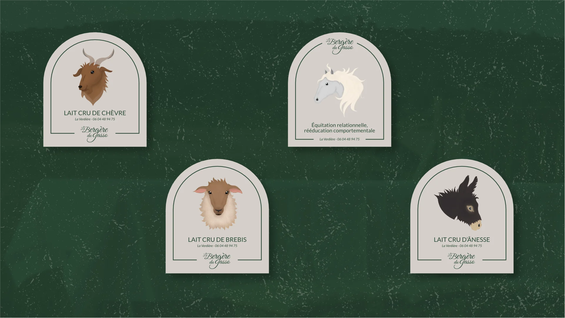 Desarrollo de logotipo, ilustraciones y manual de identidad para La Bergere du Jasso, un rancho ubicado en una provincia francesa dedicado a recibir visitantes, ofrecer talleres equinos y comercializar productos de granja como queso y leche. El proyecto necesitaba transmitir calidez y cercanía, integrando el mundo animal en la experiencia rural.
